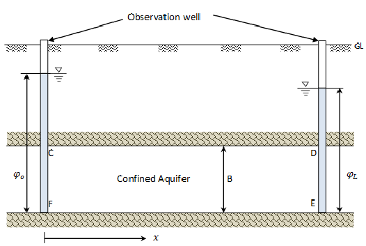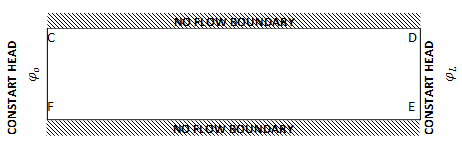 Fig. 12.3 shows the flow domain between two observation wells in case of a confined aquifer. The lines CF and DE represent equpotential lines of potential φ0 and φL respectively. Therefore on these two boundaries, Dirchlet boundary is to be applied. On the other hand at top and bottom of the surfaces of the aquifer are impervious. The lines CD and EF represent the no flow boundary. As such the Neumann boundary condition is to be applied on these two sides. Fig. 12.4 shows the aquifer with boundary conditions.