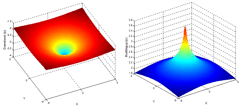 The flow towards a well, situated in homogeneous and isotropic confined or unconfined aquifer is radially symmetric. Fig. 15.1(a) shows the cone of depression caused due to constant pumping through a single well situated at (0,0) in a confined aquifer. Fig. 15.1(b) shows the cone of impression caused due to constant recharge through the well. In case of homogeneous and isotropic medium, the cone of depression or cone of impression is radially symmetrical. The governing equation derived earlier in Cartesian coordinate system for confined and unconfined aquifer can also be derived for radial flow in an aquifer. In this lecture, we will derive the governing flow equation for confined and unconfined aquifer in polar coordinate system. The main objective of this conversion is to make the 2D flow problem a 1D flow problem. The resulting 1D problem will be simpler to solve.