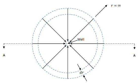 Let us consider a case of radial flow to a single well (Fig.15.2) in a confined aquifer. The Fig. 15.2 (a) shows the radial flow towards a well and a control volume of thickness dr. The Fig. 15.2 (b) shows the vertical section AA of the aquifer along with cone of depression. The aquifer is homogeneous and isotropic and have constant thickness of b. The hydraulic conductivity of the aquifer is K. The pumping rate (Q) of the aquifer is constant and the well diameter is infinitesimally small. The well is fully penetrated into the entire thickness of the confined aquifer. This is necessary to make the flow essentially horizontal. The potential head in the aquifer prior to pumping is uniform throughout the aquifer.