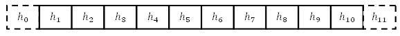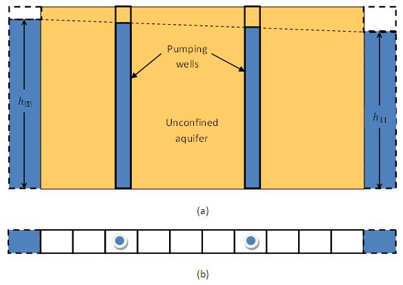Consider the unconfined aquifer as shown in Fig. 23.3. The aquifer has been discretized to 10 blocks. Constant head boundary is considered on both upstream and downstream sides of the aquifer. Lets the constant head at the upstream side is h0 and constant head at the downstream side of the aquifer is h11. Let us consider that the heads at the block centers are h1 to h10 as shown in the Fig. 23.4.