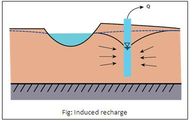 It is an indirect method of artificial recharge. In this method water is pumped from the aquifer hydraulically connected to the surface water sources like stream, river or lake. Due to pumping, a reverse gradient is formed and water from the surface water source enters into the aquifer and thus the aquifer is recharged . This method is good, especially when quality of the surface water is poor. The filtration of surface water through soil strata removes the impurities of the water. Thus the quality of the water receives in the wells is much better than the surface water. |