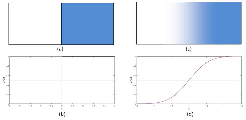 Solute in water moves from the areas of higher concentration to the areas of lower concentration. This phenomenon is known as molecular diffusion. This phenomenon can be observed by a simple experiment as shown in Fig. 31.1. The blue color of the Fig. 31.1 (a) shows the solute mixed water and the white color shows the pure water. These two fluids are separated by an impermeable thin separator. At this stage, the distance verses concentration curve will be a step curve. If we remove the impermeable barrier instantaneously, these two fluids will mix each other by the process of diffusion. Fig. 31.1(b) shows the mixing of fluid after some time. The distance verses relative concentration curve will now take a shape of S (Fig. 31.1d). The diffusion phenomenon can also be observed by putting a drop of ink in a glass of water. The ink will mix with the water as time elapses .