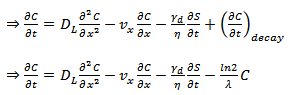 represents the radioactive half time and λ is the radioactive decay constant. Thus the one dimensional advection diffusion equation with sorption and radioactive decay process can be written as ,