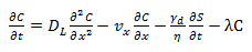 Where, λ is the inactivation coefficient. It is time a dependent coefficient. However for modeling purpose sometime it is also considered as constant. Thus for the case of virus transport in porous medium, the one dimensional advection diffusion equation can be written as,