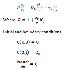 The one dimensional advection diffusion equation with sorption can be solved using the Matlab pdepe function. Initially, we will solve the advection diffusion equation with linear sorption isotherm. The governing equation can be written as,