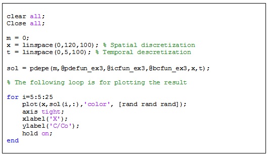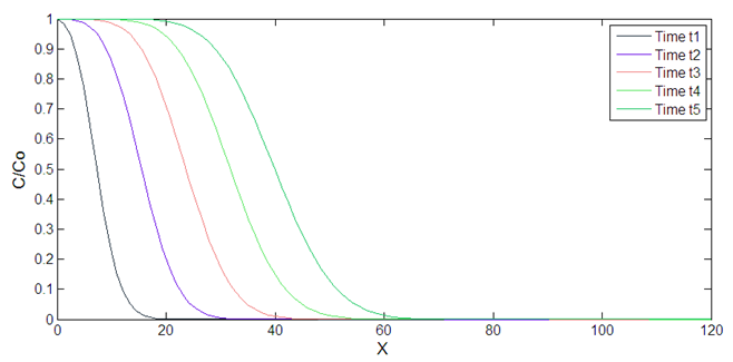 Fig. 39.1 shows the solution of the advection diffusion equation considering sorption phenomenon. The solution is obtained using the pdepe function available in Matlab.