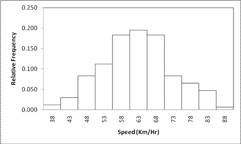 When the class width is not small the density function can be obtained by dividing the relative frequencies with the class width (known as the relative frequency density) and plotting these values in the form of a relative frequency polygon. Area of the relative frequency diagram shown in Figure 2.2 is not equals to one hence the relative frequencies are to be divided with the class width. The same is shown in Figure 2.4 for the speed data given in Table 2.1.