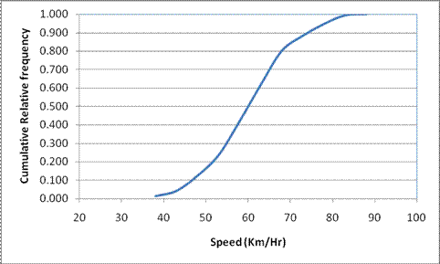 Cumulative frequency diagram is obtained by plotting the cumulative sum of the relative frequencies against the ends of the class boundaries. In the cumulative relative frequency diagrams, the ordinates represent the cumulative frequency of the occurrence of events less than or equal to the value on the abscissa. If the observed data points tend to infinity the resulting cumulative relative frequency diagram is called as cumulative distribution function. Figure 2.5 shows the cumulative relative frequency diagram of the speed data shown in Table 2.1. From the cumulative relative frequency diagrams it is easy to get the median and the other quartiles (median and the quartiles are covered in the numerical description of the data). A cumulative frequency diagram is also known as the quantile plot or the Q-plot. Quantiles are nothing but (n-1) values that divide the total frequency into n equal parts and in a quantile plot the qunatiles are shown on y-axis. Quantiles of two different data sets or the theoretical and the observed quantiles can be compared using the Q-Q plots.