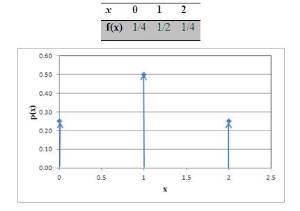 Consider a random variable X defined by the number of heads obtained when two balanced or true coins are tossed, the possible values of X are 0, 1, 2. The resulting probability distribution is described in Table 3.2. The same is shown in the graphical form in Figure 3.1.
