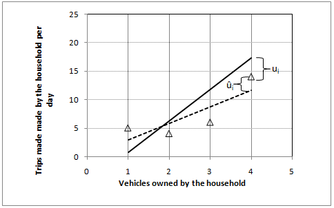 A linear regression model is formulated between the vehicles owned by the household of size five and the total number of vehicles owned by the household. The model has been formulated based on a sample of size 4. The four data points are shown in the following figure using the triangular shaped markers. Let us suppose we have the population regression function as represented by the dark line in the figure. From the four observations a sample regression function has also been estimated and is shown as the dotted line in the Figure.