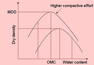 An increase in compactive effort produces a very large increase in dry density for soil when it is compacted at water contents drier than the optimum moisture content.It should be noted that for moisture contents greater than the optimum, the use of heavier compaction effort will have only a small effect on increasing dry unit weights. It can be seen that the compaction curve is not a unique soil characteristic. It depends on the compaction effort. For this reason, it is important to specify the compaction procedure (light or heavy) when giving values of MDD and OMC.