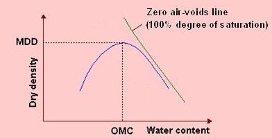 This increase in dry density continues till a stage is reached where water starts occupying the space that could have been occupied by the soil grains. Thus the water at this stage hinders the closer packing of grains and reduces the dry unit weight. The maximum dry density (MDD) occurs at an optimum water content (OMC), and their values can be obtained from the plot.
