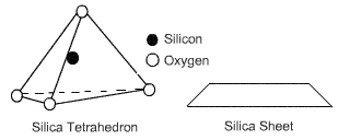 A tetrahedral unit consists of a central silicon atom that is surrounded by four oxygen atoms located at the corners of a tetrahedron. A combination of tetrahedrons forms a silica sheet. An octahedral unit consists of a central ion, either aluminium or magnesium, that is surrounded by six hydroxyl ions located at the corners of an octahedron. A combination of aluminium-hydroxyl octahedrons forms a gibbsite sheet, whereas a combination of magnesium-hydroxyl octahedrons forms a brucite sheet. |