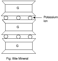 Illite consists of the basic montmorillonite units but are bonded by secondary valence forces and potassium ions, as shown. There is about 20% replacement of aluminium with silicon in the gibbsite sheet due to isomorphous substitution. This mineral is very stable and does not swell or shrink.