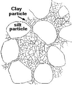 CLAY particles are flaky. Their thickness is very small relative to their length & breadth, in some cases as thin as 1/100th of the length. They therefore have high specific surface values. These surfaces carry negative electrical charge, which attracts positive ions present in the pore water. Thus a lot of water may be held as adsorbed water within a clay mass. |