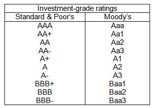 Credit ratings by the leading rating agencies such as Standard & Poor's and Moody's vary from prime credit level of AAA/Aaa to minimum 'investment grade' rating of BBB-/Baa3. The gradations of the rating levels of the above-mentioned rating agencies are given below. Most of the PPP project ratings are at the lower end of this range.