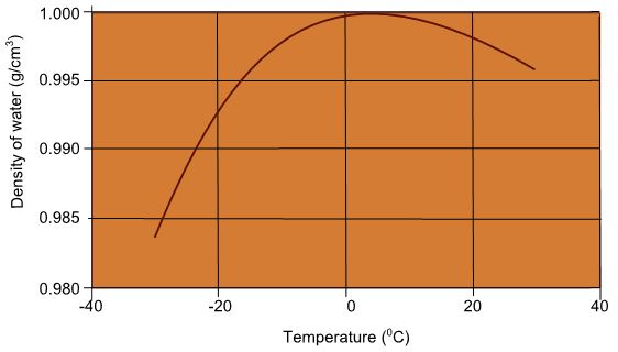 The density of water can directly influence the physical and mechanical behavior of unsaturated soils beacuse many unsaturated soil parameters depend on the water density. The density of water, in-turn, is a function of temperature as shown in Fig. 2.8. Most materials (like mercury, Gold, etc.) decrease their volume consistently when the temperature decreases. Nevertheless, when water is cooled down steadily from its boiling point, the volume decreases up to 4°C and then water expands until it freezes. The freezing point temperature for water is 0°C where water undergoes phase transformation from liquid to solid. As ice starts to melt upon heating, some of the hydrogen bonds break, and water molecules can slide closer together when compared to its solid state, i.e. ice. The ice is about 10% less denser than cold water at 4°C. The volume expansion of water below 4°C temperature is called anamoulous expansion of water. Such expansion causes bursting of frozen pipes and frostbites on human skin in the cold countries. Therefore, the density of water increases up to 4°C and then decreases below this temperature as shown in Fig. 2.8. The ice (< 4°C) can float on water due to these consequences. The ice displaces more water volume than its weight. Moreover, the conduction of heat is dependent on the density of the substance. A material with less dense conducts less heat than the denser material/substance. Therefore, when the lakes freeze with the formation of ice (which floats on the surface due to less density than the water) conducts less heat through it helping the deeper layers of water to maintain warm temperatures beneath the ice sheet. The aquatic life survives because of this peculiar and anomalous expansion of the water in the cold places as illustrated in Fig. 2.9. If the water had to behave similar to other substances, all water bodies including the ocean would freeze solid during the winters and only the upper layers of the ocean would thaw during the summer.
