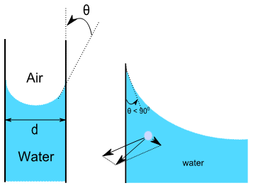The air-water interface will curve to form a meniscus when it comes in contact with solid surface. The meniscus angle with the solid surface, measured in the water, are lower than 90 0 (acute contact angles) when adhesive forces between solid walls and water molecules dominate the cohesive forces between the water molecules, On the other hand, obtuse contact angle are observed when cohesive forces dominate the adhesive forces. Acute contact angles are typical for interactions between pore water and soil solid surfaces. The curvatures of the menisci generate water pressures lower or higher than the air pressure depending on whether the contact angle is acute or obtuse angle, respectively. Let us consider a capillary tube of diameter d immersed in a water body as shown in Fig. 3.3. The meniscus is concave on the air side with a contact angle θ , as shown in the same figure. The water pressure at the back of the meniscus can be calculated considering the vertical force equilibrium of the air-water interface. The resultant mathematical equation can be expressed as