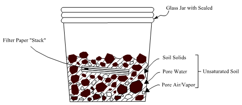 Filter paper technique is an alternative to complex testing techniques described in the previous sections. This technique is very simple, cheap, and reasonably accurate for the practical measurement purposes. There are two types of measurement procedures using filter paper technique, viz. contact and non-contact technique, as described in the American Society for Testing and Materials (ASTM) - D5298. The former technique is used for the measurement of matric suction and, alternatively, former technique for total suction measurement. Only the contact filter paper technique is described here for the measurement of matric suction and the other method is explained later sections. The filter paper technique is based on measuring the amount of moisture transfer from the soil sample to an initially dry filter paper when the filter paper is placed in contact with soil sample as shown in Fig. 15.