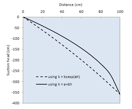 The head distribution is completely different by both the methods due to the wide variation in the assumed conductivity relationships. The conductivities vary in several orders by the assumed relationships. The discharge fluxes got adjusted to satisfy the boundary conditions. Therefore, a correct hydraulic conductivity functional relationship is required for estimating an accurate head distribution.