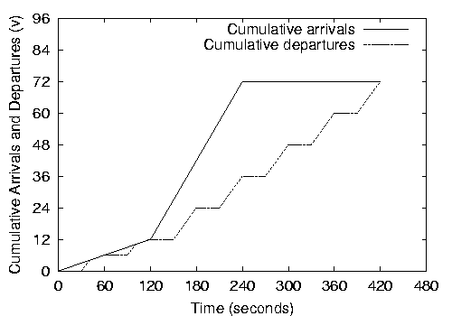 Fig 16. Example: Plot of cumulative number of arrivals and departures of vehicles versus time.