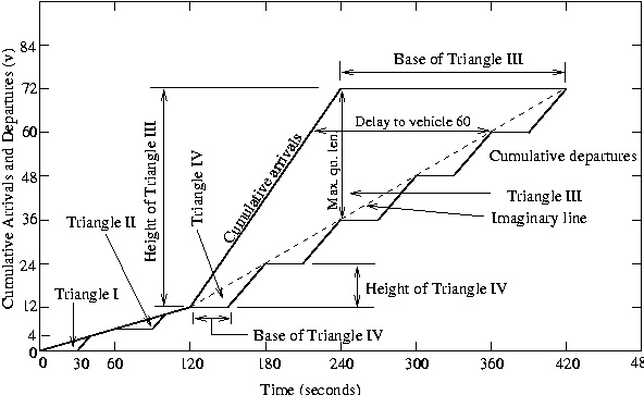 We can also determine the average delay directly from the graph, by noting that the area of either Triangle I or Triangle II in Figure 16 (which is the same as Figure 15 but with few extra annotations) divided by the total number of arrivals during a cycle will give the average delay. Therefore,