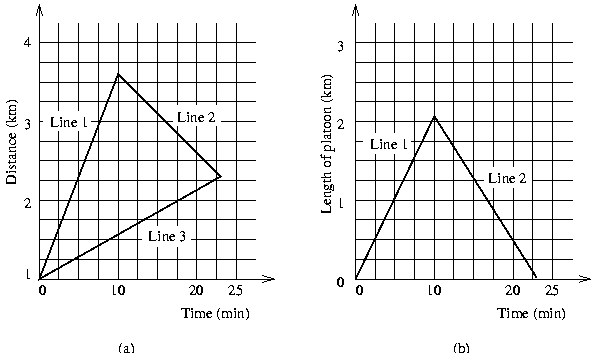 Consider the distance-time diagram shown in Figure 4 plotted for the scenario described in the problem. This diagram is shown here to help the reader understand the problem better; strictly speaking the complete diagram is not necessary for solving the problem. However, an understanding of the physical scenario is of definite help.