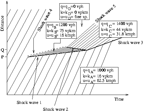 (iv) Both shock waves 1 and 2 will end if the platoon condition (i.e., condition B) ends. This condition will end whenever Shock waves 1 and 2 meet. Say they meet at time t hours after the start of Shock wave 1, where their positions must be the same. Their positions at time can be determined from their starting positions and distances by which these travel during time t. Thus, knowing that P is 1 km from BM and Q is 3.67 km from BM, one can write the following
