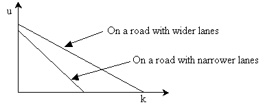 For example, if the u-k relations on two roads with varying lane (road) widths are plotted then conceptually they may look something like what is shown in Figure 1. (The reason for using straight lines for the u-k relation is purely to make the figure easier to comprehend). As can be seen, chances are that both free flow speed and jam density will be lesser in the case of the narrow lane width road than in the case for a wide lane width road. Further, and more importantly, the speed at any given density is expected to be lower on the narrow road. This is because individual drivers will drive at a lesser speed at a given distance headway than they would have done on the wider road possibly due to a higher perception of threat to ones safety on the narrow road.