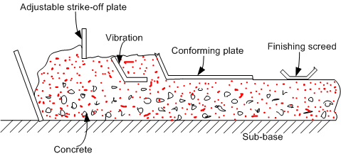 Concrete is spread evenly and is rodded with suitable equipment such that formation of honey-combing or voids can be avoided. At the same time, over-compacting needs to be avoided, which can cause segregation and loss of entrained air ( Swanlund and Vanikar 2002 ). The working of fixed form and slip form pavers are different - and has been discussed briefly in the following: