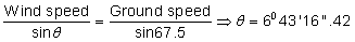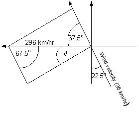 Effective ground speed = (2962 + 362 - 2x296x36xcos67.5) 1/2 = 284.176 km/hr.