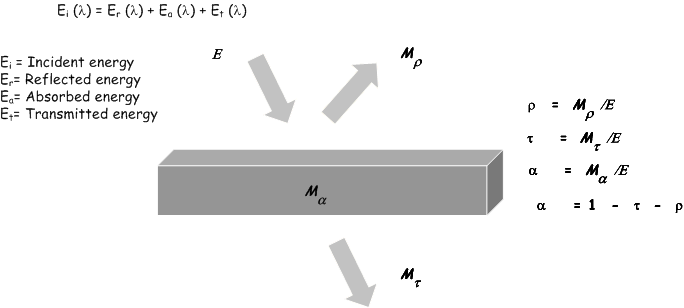- Along with brightness, radiance, radiant flux, etc., several more terms are needed to discuss the interaction of radiation with matter. These terms are: Reflectance, Transmittance, Absorptance, Emissivity