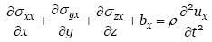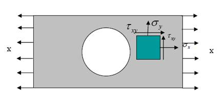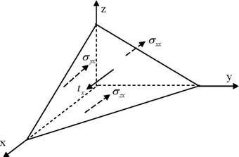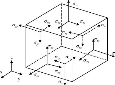 A material particle suffers a state of stress. To talk about stress we need to talk about internal forces. We must expose the internal forces by drawing a free-body diagram. Represent the material particle by a small cube, with its edges parallel to the coordinate axes. Cut the cube out from the body to expose all the internal forces on its 6 faces. Define a component of stress by a component of force per unit area. On each face of the cube, there are three components of stress, one normal to the face (normal stress), and the other two tangential to the face (shear stresses). Now the cube has six faces, so there are a total of 18 components of stress. A few points below get us organized.