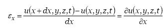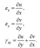 The displacements relate the change in geometry from the original to the displaced configuration. Again, we are assuming displacements much smaller than the dimensions of the system. The strain components are defined as