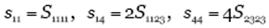 The components of the stiffness tensor relate to the corresponding components of the stiffness matrix as