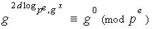 . We know Φ(pe) = pe-1 (p-1). Thus the given modular equation is solvable since gcd(2, pe-1 (p-1)) = 2 | 0 and it has exactly 2 solutions namely ±1 (By Inspection).