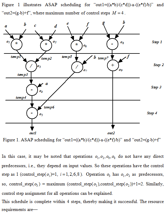 As-Late-As-Possible (ALAP) scheduling is almost similar to ASAP, but instead of scheduling operations to early control steps, in ALSP, first the maximum number of control steps that are allowed is determined. Following that, the algorithm schedules each operation, one at a time, into the latest possible control step. In other words, ALAP algorithm schedules operations in the latest possible control step, subject to satisfying the (reverse) partial order, i.e., an operation is scheduled if and only if all its successors are scheduled in latter control steps. If ALAP algorithm can schedule all the operations within 1st control step (as we move backward), scheduling is successful. It may be noted that like ASAP, ALAP algorithm also does not consider any resource constraints.