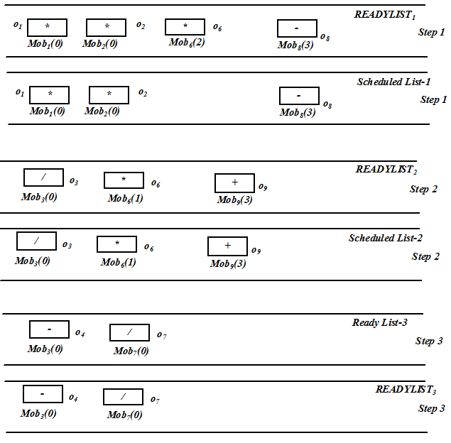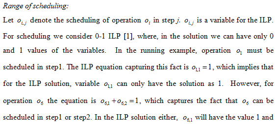 In the ILP for scheduling, we have four sets of equations namely, (i) to capture the range ([ASAP-ALAP]) in which an operation can be scheduled, (ii) requirement that there is no violation of resource constraints, (iii) data dependency and (iv) optimize the resource requirements. Now we will formulate equations for each of these cases for the running example.
