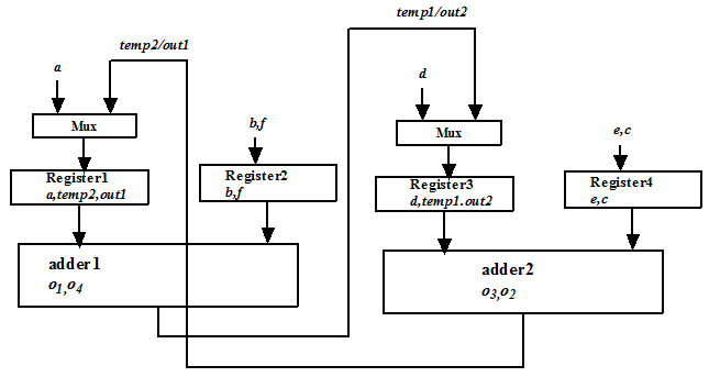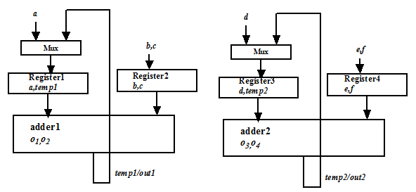 It may be noted that as two data transfers (point 1 and point 2, above) are binded to regsiter1, we need a multiplexer that feeds to the input of register1. Similarly, we require a multiplexer at input of register3. It may be noted that even if two data transfers “reading b from input bus” and “reading c from input bus” are binded to register2, there is no multiplexer at input of register2. This is because we connect the input line to register2, where in step1 we have value of b and in step2 we have value of c. For a similar reason we do not require a multiplexer for input of register4.