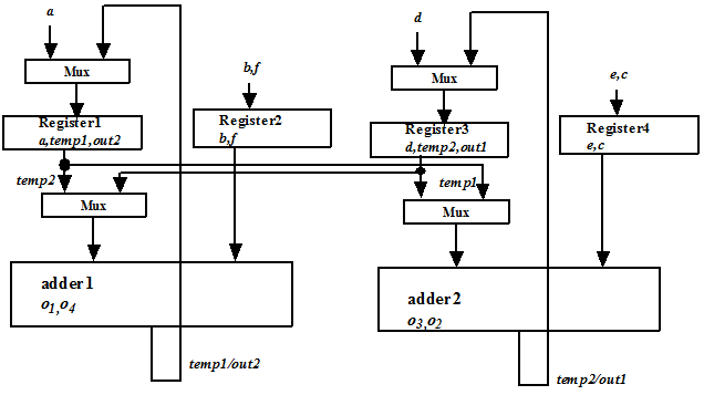 The interconnects are illustrated in Figure 4 and can be interpreted in a similar manner as discussed for the last two cases. It may be noted that in this case we require four multiplexers in the circuit. Two multiplexers at inputs of register1 and register3 are added for the same reason as discussed in the last two cases. Now we see why two more multiplexers at inputs of both the adders are required. It may be observed from Figure 4 that data transfer “ a to operand of adder1” is binded to interconnect “register1 (source)--left input of adder1 (destination)” and “ temp2 to operand of adder1” is binded to interconnect “register3 (source)--left input of adder1 (destination)”. As there are two different interconnects for the left input of adder1, we require a multiplexer. Similarly, we require another multiplexer at input of adder2.
