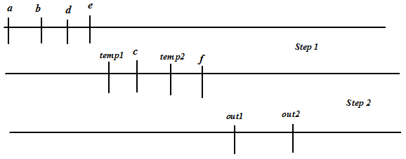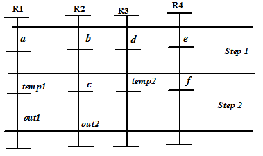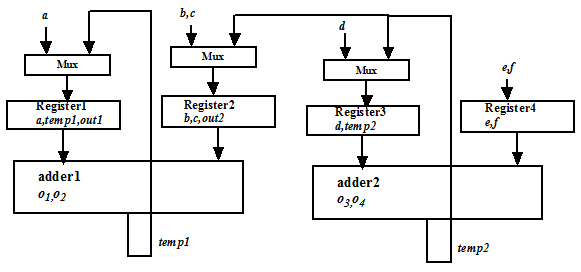 Figure 9 illustrates list scheduling for the variables (ordered) shown in Figure 8. We take register R1, and in the process of traversal we first start with variable a ; variable a is filled in R1 and it occupies step1 in R1. Following that we traverse variables b,c,d but cannot put them in R1 as they would overlap with a . Variable temp1 can be filled in R1 and it occupies step2. Finally variable out1 is put is R1. As there are more variables, we take another register R2 and repeat the procedure. Final binding, comprising 4 registers is shown in Figure 9. The circuit corresponding to this binding is shown in Figure 10 (we assume that operations 01,02 are binded to adder1 and operations 03,04 are binded to adder2). It may be noted that three multiplexers are required in this case, while the binding corresponding to Figure 2 requires two multiplexers.