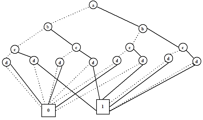 Figure 3 illustrates the intermediate BDD when R1 is applied to the BDT of Figure 2. It may be noted that there is only one leaf node with “0” and another one with “1”. From Figure 2 it may be observed that the path from root to leaf node corresponding a=b=c=d=0 reaches a leaf node with “0”. Also the path from corresponding to a=b=c=0; d=1reaches a leaf node with “0”. Now as there is a single node at leaf level with “0” in the RBDD (Figure 3) both the paths corresponding toa=b=c=d=0 anda=b=c=0; d=1 has been redirected the single “0” leaf node. Similarly, redirection of all paths in Figure 3 can be explained.
