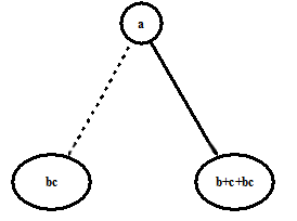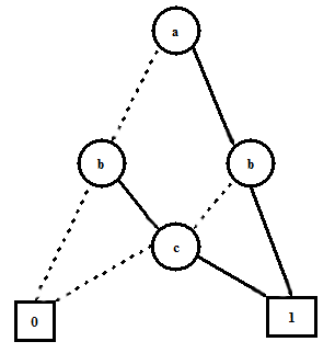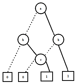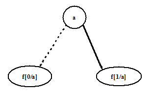 Diagrammatically, a BDD of a function of variable a is rooted at a node representing variable a , and its children represent the two sub-functions whose sum results in the original expression. The child of the root with dotted line from parent represents f[0/a] and the one with solid line from parent represents f[1/a] . BDD of a function of variable a is shown in Figure 12.
