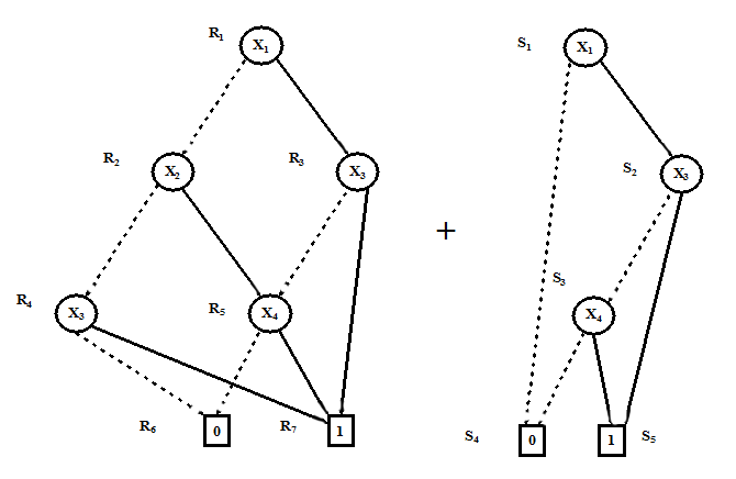 The example given in Figure 5 through Figure 7 illustrates the working of apply Algorithm. Figure 5 illustrates two ROBDDs which are ORed. Figure 6 illustrates the steps of the apply algorithm. Figure 7 illustrates the final OBDD after reduction; the result of apply( +, Bf, Bg ) may not be reduced one.