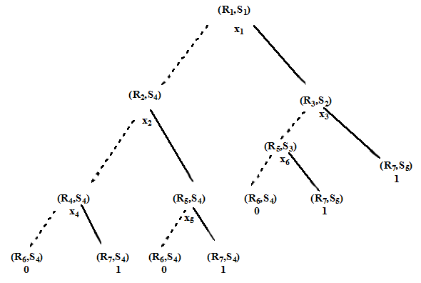 Terminal node (R6 ,S4 ): According to Step-3 on x 4 (R4 ,S4 )-- If r f (R 4 in x 4 ) is an x i -node, but rg (S4 in x4 ) is a terminal node or an xj-node with j > i , create an xi -node n (called r f, r g=x4 ) with a dashed line to apply ( op , lo( rf ) , r g ) =(OR,R6 ,S4 ), which is Terminal node (R6 ,S4 ) . The value of