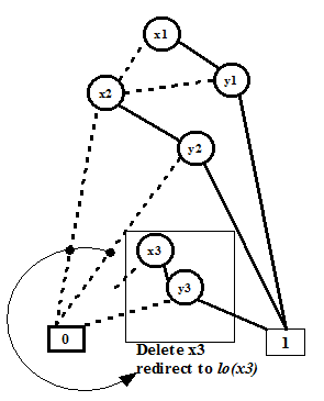 We will explain restrict algorithm for the Boolean function f = x1.y1 + x2.y3 + x3.y3 . After applying restrict(0, x3 , Bf ), f becomes, f[0/x3] = x1.y1 + x2.y3. Figure 8 illustrates the ROBDD for f. Figure 9 illustrates Step1 of restrict on ROBDD of Figure 8. Final ROBDD after restrict(0, x3 , Bf) is shown in Figure 10.