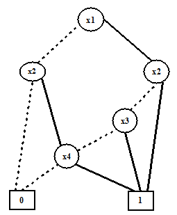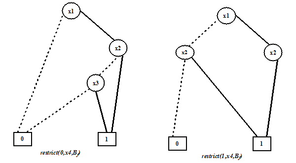 Let is consider another function f1 = x1x2 + x1x3 + x1x4 + x2x4 ; the OBDD for f1 is shown in Figure 13. OBDD for restrict(0,x4, Bf) and restrict(1,x4,Bf)) is shown in Figure 14.