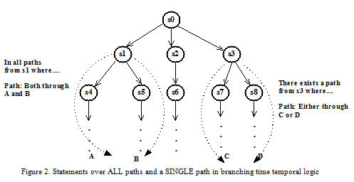 Branching-time logic allowing us to quantify statements over ALL paths and a SINGLE path from a state ; the concept is shown in Figure 2.