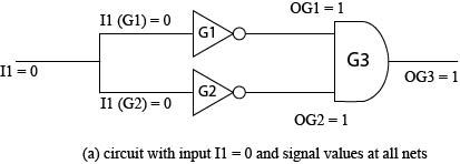 Form the discussion in the last section it can be noted that parallel fault simulation can speed up the procedure only by a factor that is dependent on the bit width of the computer being used. In this section we will discuss about deductive fault simulation, a procedure which can determine in a single iteration, detectability/undetectability about all faults by a given random pattern. In the deductive method, first the fault-free circuit is simulated by a random pattern and all the nets are assigned the corresponding signal values. “Deductive”, as the name suggests, all faults detectable at the nets are determined using the structure of the circuit and the signal values of the nets. Since the circuit structure remains the same for all faulty circuits, all deductions are carried out simultaneously. Thus, a deductive fault simulator processes all faults in a single pass of simulation augmented with the deductive procedures. Once detectability of all the faults for a random pattern is done, the same procedure is repeated for the >> random pattern after eliminating the covered faults.
