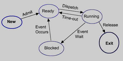 When a process starts to execute, it is placed in the process queue and it is in the new state. As resources become available, then the process is placed in the ready queue.At any given time a process may be in one of the following five states.